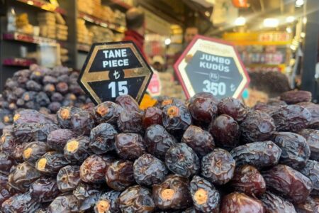 Murat Üzümcü, seit 20 Jahren Händler auf dem Gewürzbasar, „Medina-Datteln kosten 480 Lira pro Kilo und 15 Lira pro Stück. Die Getreidepreise schwanken zwischen 10 und 15 Lira und steigen sogar auf bis zu 20 Lira. Letztes Jahr war es günstiger. Da es aus Jerusalem kommt, steigt es mit steigendem Dollar, und der Preis richtet sich nach dem Dollar.“sagte
