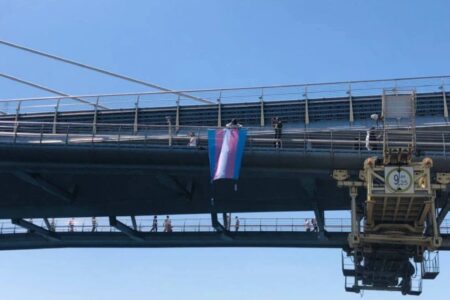 Die Istanbuler Abgeordneten Özgül Saki und Kezban Konukçu hängten die Transgender-Flagge an der Atatürk-Brücke am Goldenen Horn auf.