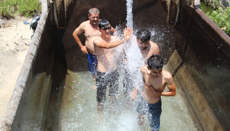 Sechs LKW-Fahrer, die im Bezirk Çıplaklı Aushubarbeiten durchführten, beschlossen, während ihrer Mittagspause ihren LKW-Anhänger mit Wasser zu füllen und ihn in einen Pool zu verwandeln.