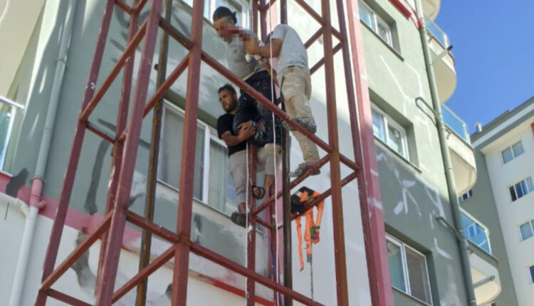 Ein Bauarbeiter blieb an seinem Sicherheitsgurt hängen, als er in Osmaniye vom Gerüst fiel.
