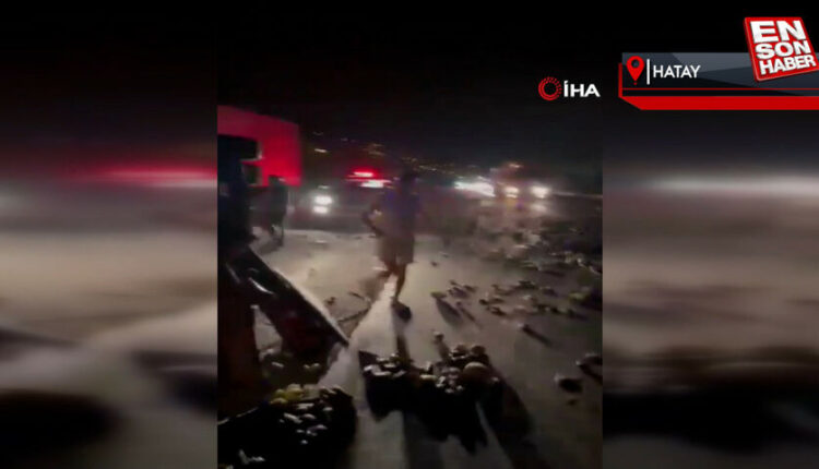 Artefakte eines mit Gemüse und Obst beladenen Pickups, der in Hatay mit einem Lastwagen kollidierte, wurden auf der Autobahn verstreut. Die Fahrer beider Fahrzeuge wurden bei dem Unfall verletzt.