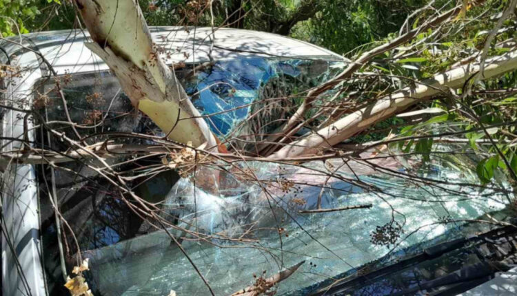 Der Ast brach ab und fiel auf die Windschutzscheibe des Fahrzeugs, wodurch die Windschutzscheibe zerbrach und die Motorhaube beschädigt wurde.