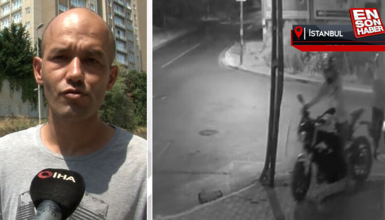 Das Motorrad, das in Istanbul an einem Strommasten befestigt war, wurde von drei Personen mit einer Eisenschere in der Hand gestohlen.