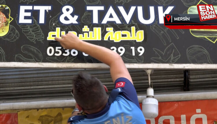 Bei den am Ende des Bezirks durchgeführten Kontrollen und Inspektionen entfernten Gruppen der Polizeibehörde der Gemeinde Akdeniz im zentralen Bezirk von Mersin arabische Schilder, Wimpel und verschiedene Werbematerialien, die an den Fenstern oder Wänden von Dutzenden Arbeitsplätzen hingen.
