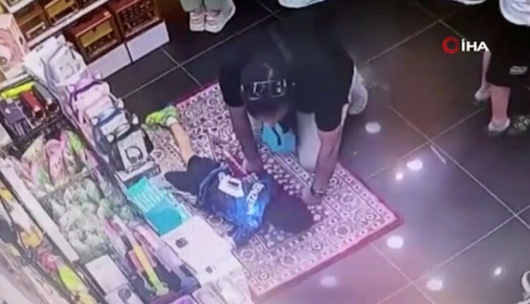 Der Ladenbesitzer berührte die Aktion des arabischen Touristen, indem er für seinen schläfrigen Sohn, der zu seinem Arbeitsplatz in Trabzon kam, einen Gebetsteppich auf dem Boden ausbreitete und ihm half, eine Weile zu schlafen.