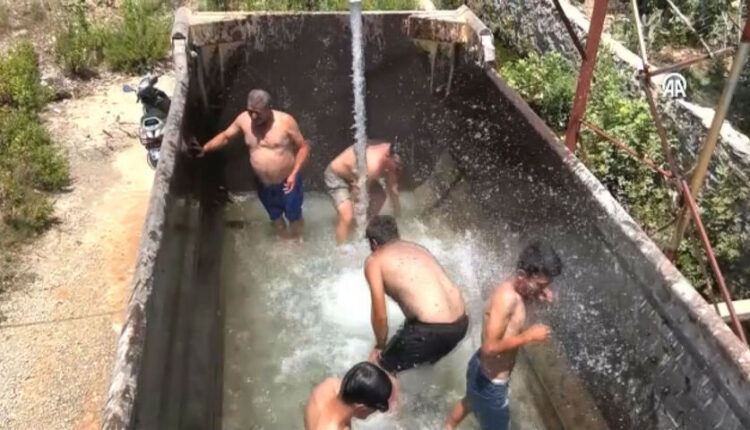 In Alanya stiegen sechs Fahrer zur Abkühlung in einen mit Wasser gefüllten Anhänger. Uyar, einer der Fahrer, sagte: „Sie finden uns vielleicht seltsam, aber wir haben uns gut abgekühlt.“