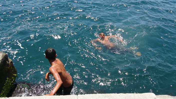 Diejenigen, die von der Hitze überwältigt waren und am Karaköy-Ufer eine Verschnaufpause einlegten, erfrischten sich beim Schwimmen im Meer.