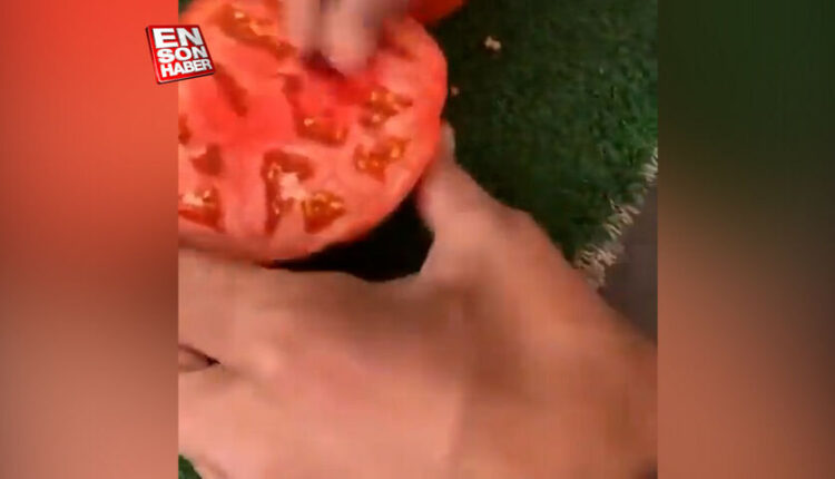 Auf einem in den sozialen Medien verbreiteten Bild nahm ein Vermarkter, der die Farbe der Tomate in Rot ändern wollte, eine Kirsche und rieb sie auf der Tomate.