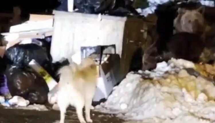 Die Bärenfamilie, bekannt als die „schlaflosen“ Bären von Uludağ, ging nach Sarıalan, um Nahrung zu finden. Der Hund störte die Bären, die fröhlich das Futter fraßen, das sie im Müll fanden.