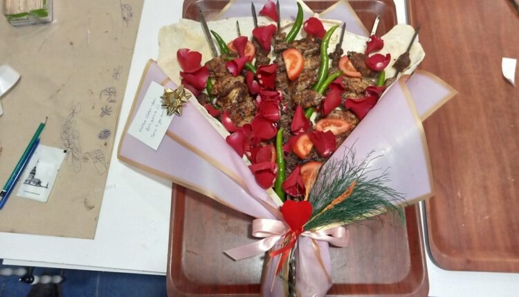 Belma Aykül Yıldız aus Samsuns Stadtteil Terme wollte am Valentinstag ihren Ehemann, mit dem sie seit 10 Jahren verheiratet ist, den Friseur İlyas Yıldız, überraschen. Yıldız ließ es von ihrem Mann, der gegrilltes Fleisch und Hühnchen liebt, beim Metzger zubereiten. gegrilltes BouquetEr schickte es als Geschenk.