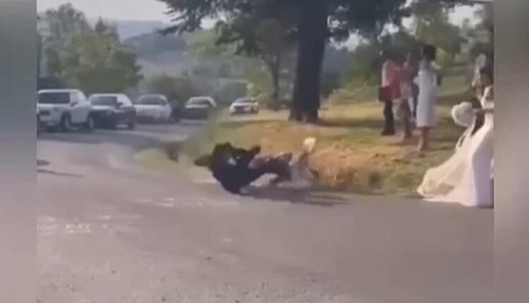 Der Bräutigam verlor plötzlich das Gleichgewicht, als er auf sein Motorrad stieg und sich der Straße zum Hochzeitsbereich näherte.