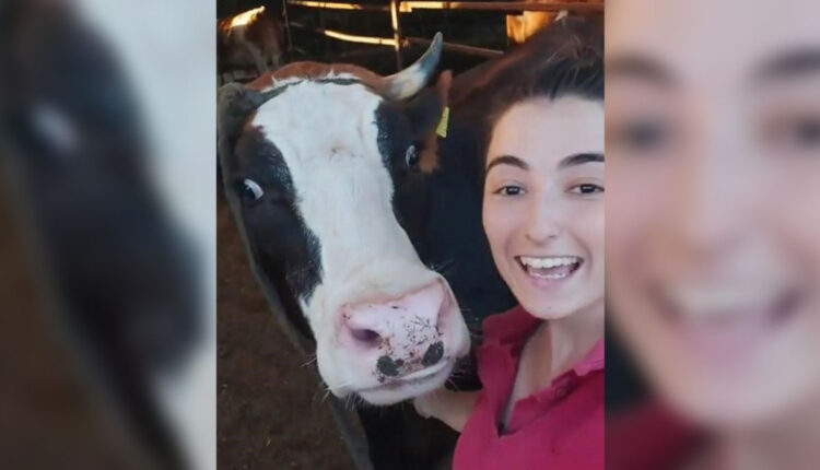 Şerife Yılmaz, die sich um die Tiere auf dem Bauernhof kümmert, nennt eine Kuh beim Namen, den sie in dem von ihr aufgenommenen Video angegeben hat, und sagt: „Komm, lass uns ein Selfie machen“rief er.