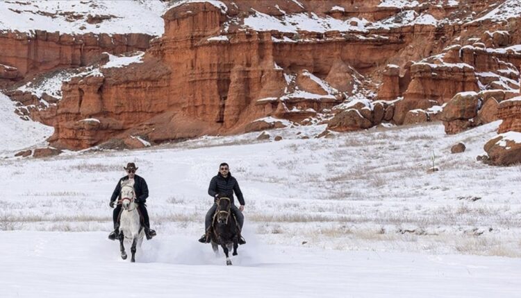Feenkamine, die jedes Jahr von Tausenden einheimischen und ausländischen Touristen besucht werden, färbten sich durch den fallenden Schnee rot und weiß. Aufmerksamkeit erregten auch einige Besucher, die mit ihren Pferden zu den Feenschornsteinen kamen, die zu den wichtigen touristischen Potenzialen der Region zählen. Die auf ihren Pferden galoppierenden Bürger vergnügten sich bei der einmaligen Aussicht.