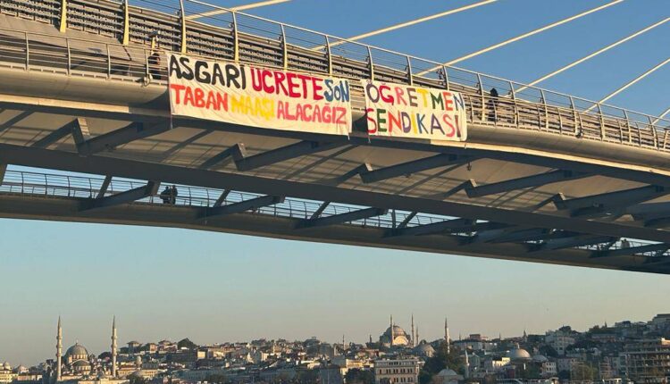 Lehrer, die in Klassenzimmern, Kursen und Privatschulen arbeiteten, rebellierten erneut gegen die Löhne, indem sie ein Transparent an der Brücke über das Goldene Horn aufhängten.