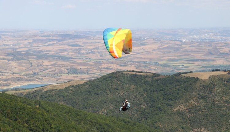 Uçmakdere, wo die Wälder am Fuße des Ganos-Gebirges in Tekirdağ mit dem Marmarameer verschmelzen, bringt Gleitschirmflieger mit dem Himmel zusammen.