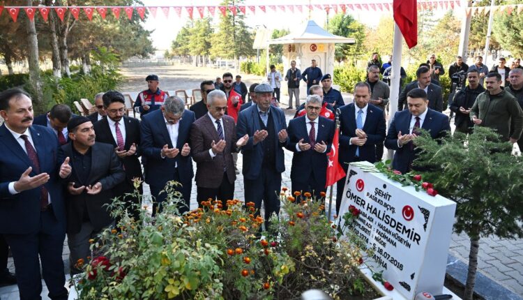 Minister Uraloğlu betete zusammen mit dem Vater des Märtyrers Halisdemir, Hasan Hüseyin Halisdemir, am Grab des Märtyrers, hörte der Koranlesung zu, ließ Nelken auf dem Grab liegen und goss Wasser aus.