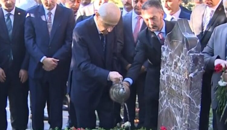 Bahçeli, der mit seinem Stab Blumen auf Türkeşs Grab legte, goss Wasser auf das Grab.
