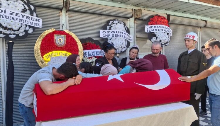 Der Sarg des Spezialfeldwebels Burak Sefa Ürüm, dessen Leichnam, in die türkische Flagge gehüllt, in seine Heimatstadt, den Bezirk Selendi in Manisa, gebracht wurde, wurde vor seinem Wohnsitz im Bezirk Zafer abgeholt und dort wurde sein Segen empfangen.