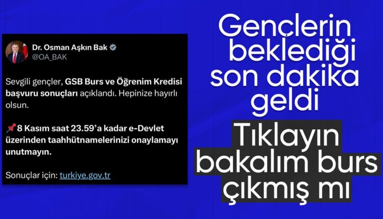 Der Minister für Jugend und Sport, Osman Aşkın Bak, teilte auf seinem Social-Media-Konto einen Beitrag mit, in dem er erklärte, dass die mit Spannung erwarteten Ergebnisse der GSB-Stipendien- und Inkassodarlehensbewerbungen für das Studienjahr 2024–2025 bekannt gegeben wurden.
