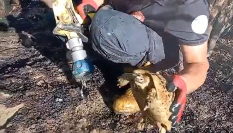 Die Teams sahen, wie sich die Schildkröte inmitten der Flammen in ihrem Panzer versteckte, und versuchten, sie am Leben zu erhalten, indem sie sie minutenlang mit Wasser kühlten.