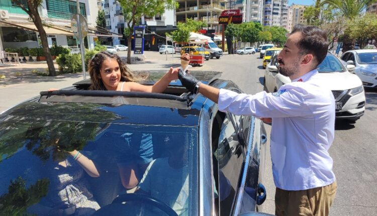 Um die Bürger bei dem schwülen Wetter ein wenig abzukühlen, verteilten Ahmet Biralmış, Präsident der Adana Cooks and Pastry Makers Association, und Mitglieder der Jugendabteilungen der Vereinigung Eis an die Wartenden an roten Ampeln und in Kleinbussen.