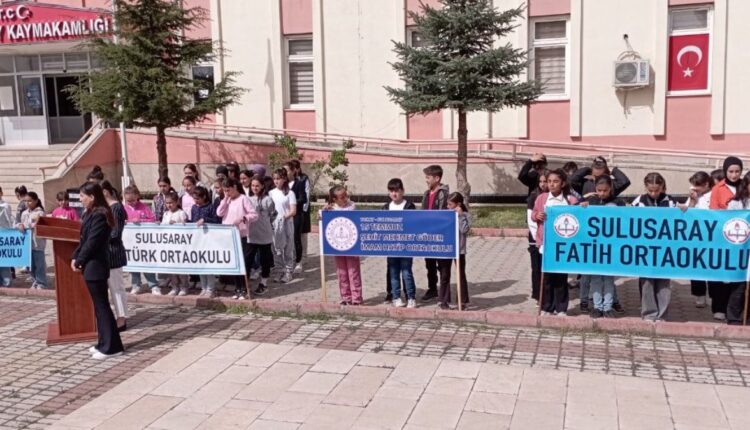 Der nationale Bildungsdirektor des Bezirks Sulusaray, Zakir Alma, überreichte bei der Zeremonie im Rahmen des Nationalen Souveränitäts- und Kindertages am 23. April einen Kranz zum Atatürk-Denkmal.