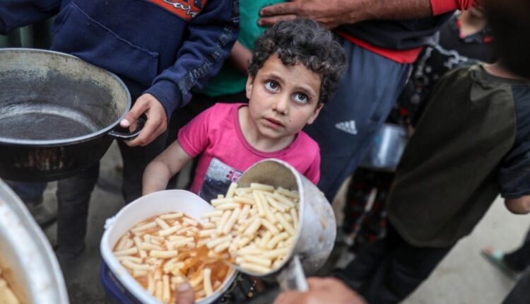 In Gaza, wo sich die humanitäre Lage von Tag zu Tag verschlechtert, stehen Hunderte von Kindern, die hungern müssen, mit Töpfen in der Hand Schlange, um Essen zu bekommen.