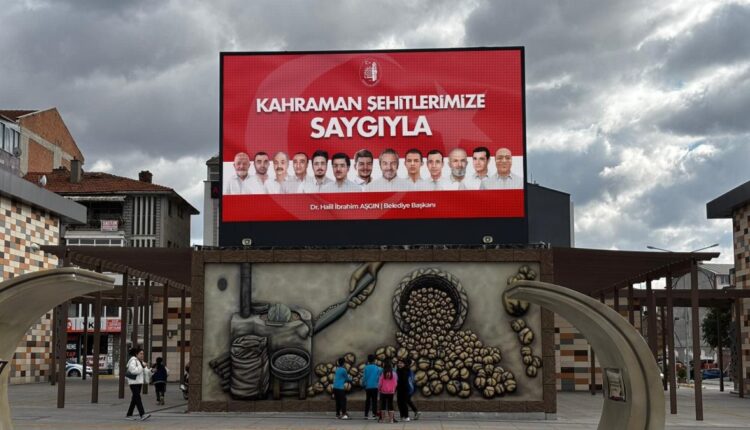 Märtyrer aus Çorum, die bei dem verräterischen Putschversuch vom 15. Juli für die Demokratie starben; Visuell mit Fotografien von Erol Olçok, Abdullah Tayyip Olçok, Akif Kapaklı, Emin Güner, Mustafa Avcu, Ali Alıtkan, Ali Karslı, Mehmet Kocakaya, Mustafa Karasakal, Mustafa Solak, Osman Arslan, Ümit Çoban und Yakup Kozan „Im Hinblick auf unsere heldenhaften Märtyrer“Die Erklärung wurde auf allen LED-Bildschirmen der Stadt widergespiegelt.