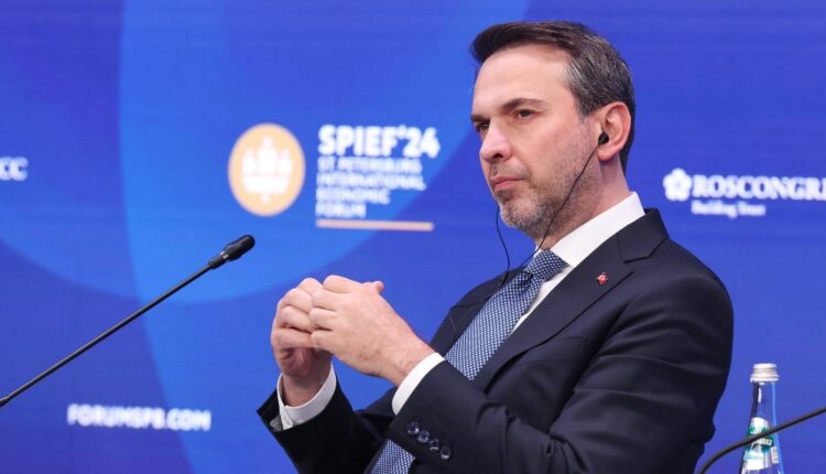 Minister für Energie und natürliche Ressourcen Alparslan Bayraktar, St. Petersburg, Russland. Er sprach auf der Sitzung mit dem Titel „Technologisches Ökosystem der Zukunft: Zum Wohle der Menschheit und des Planeten“, die im Rahmen des St. Petersburg International Economic Forum (SPIEF) stattfand.
