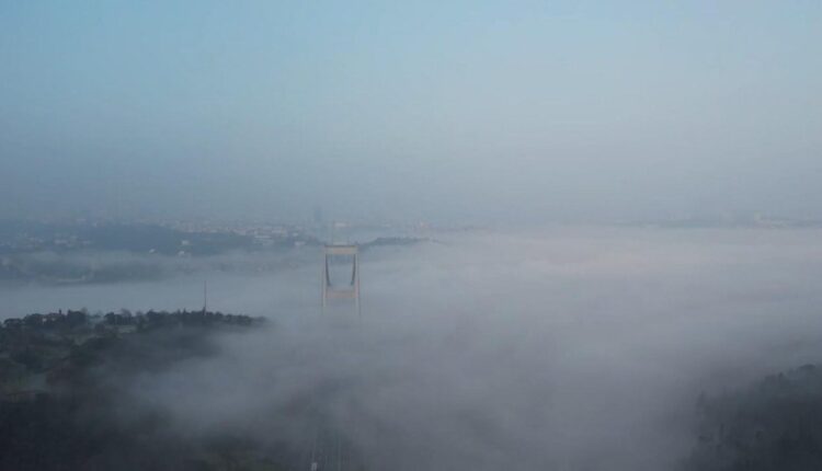 Die Fatih-Sultan-Mehmet-Brücke (FSM) unter dem Nebel wurde aus der Luft betrachtet und das Ausmaß des Nebels deutlich.