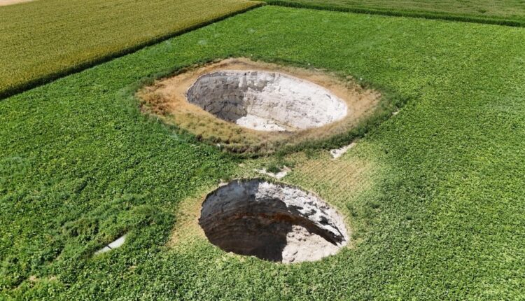 Innerhalb weniger Tage bildeten sich auf zwei verschiedenen Feldern Dolinen mit einer Tiefe von 2 Metern.