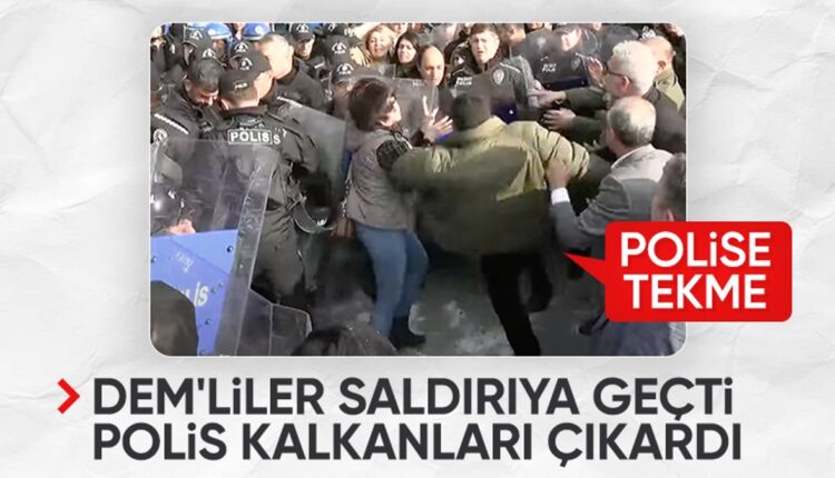Mitglieder der DEM-Partei griffen die Polizei an und versuchten, die Polizeischilde durch Fußtritte zu durchbrechen.