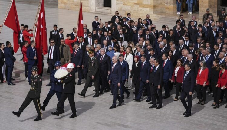 Die vom Präsidenten der Großen Nationalversammlung der Türkei, Numan Kurtulmuş, angeführte Delegation hinterließ den Kranz mit einem Halbmond und einem Stern am Atatürk-Mausoleum.