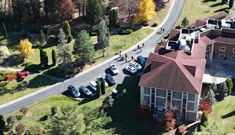 Auf dem Parkplatz der Farm und rund um das Hauptgebäude waren viele Fahrzeuge und Menschenmassen zu sehen.
