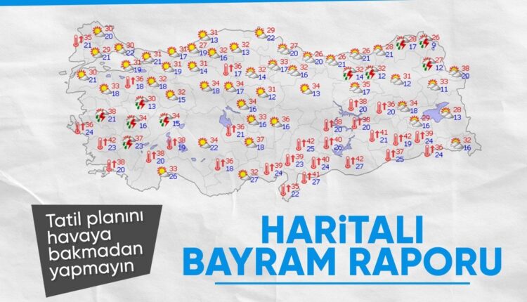 Die höchsten Temperaturen des Tages, die während des Feiertags erwartet werden, werden in Ankara und Istanbul auf etwa 32 Grad, in Izmir auf 37 Grad, in Antalya auf 39 Grad, in Adana auf 38 Grad, in Diyarbakir auf 40 Grad, in Samsun auf 28 Grad und in Samsun auf 30 Grad steigen Erzurum.