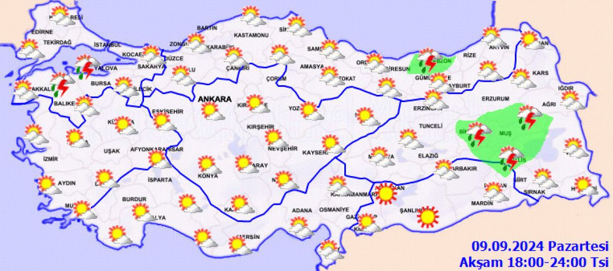 In der Erklärung von Meteorology hieß es außerdem: „ Zentrales und östliches Schwarzes Meer, der Norden Ostanatoliens und die umliegenden Gebiete von Zonguldak, Düzce, Sinop, Tunceli, Elazığ, Bingöl, Muş, Bitlis, Batman, Siirt, der Norden von Balıkesir, der Osten von Muğla, die inneren Teile von Antalya, Diyarbakır. „Es wird behauptet, dass es im östlichen Teil von Van und im südlichen Teil von Van zu lokalen Schauern und Gewittern kommen wird.“Es wurde gesagt.