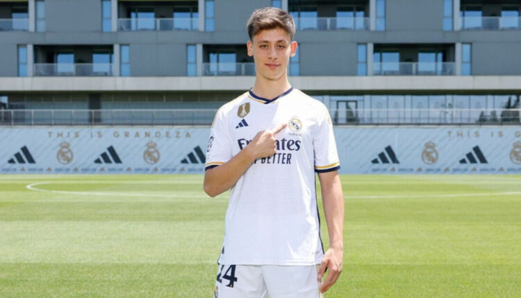 Arda Güler, der einen Vertrag mit dem Präsidenten von Real Madrid, Florentino Perez, unterzeichnete, posierte mit seinem Trikot mit der Nummer 24 für die Kameras.